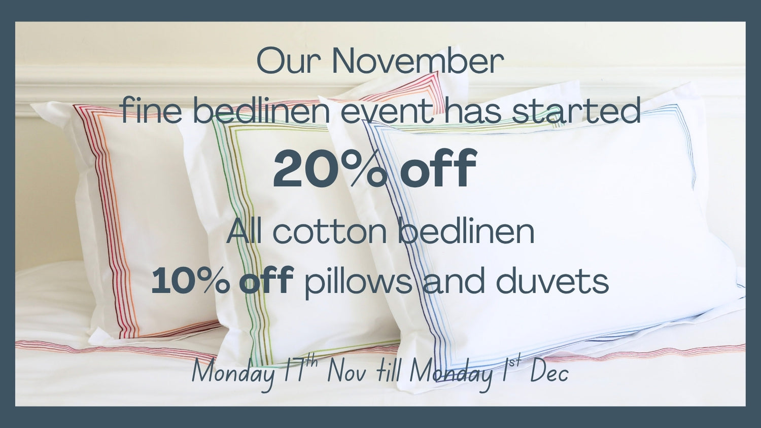 20% off our fine cotton bedlinen for two weeks. Also other special reductions