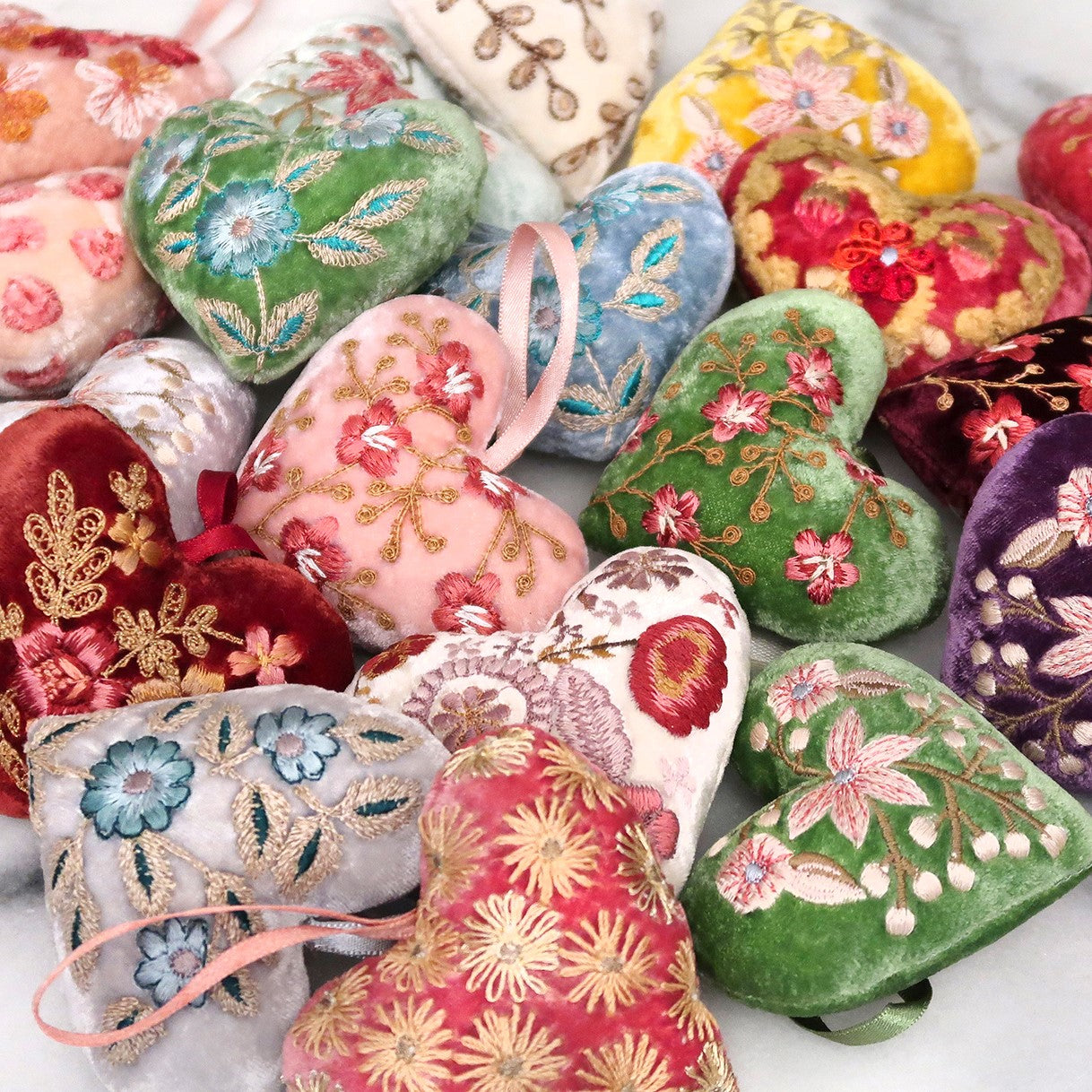 Anke Drechsel works with silk velvet and embroidery to create the most beautiful objects and cushions. Her master craftsmen use both fine hand embroidery and small hand-guided machines to achieve intricate and visually stunning designs. Perfect as a pin cushion or decorative item these small hearts make a lovely thoughtful and timeless gift.