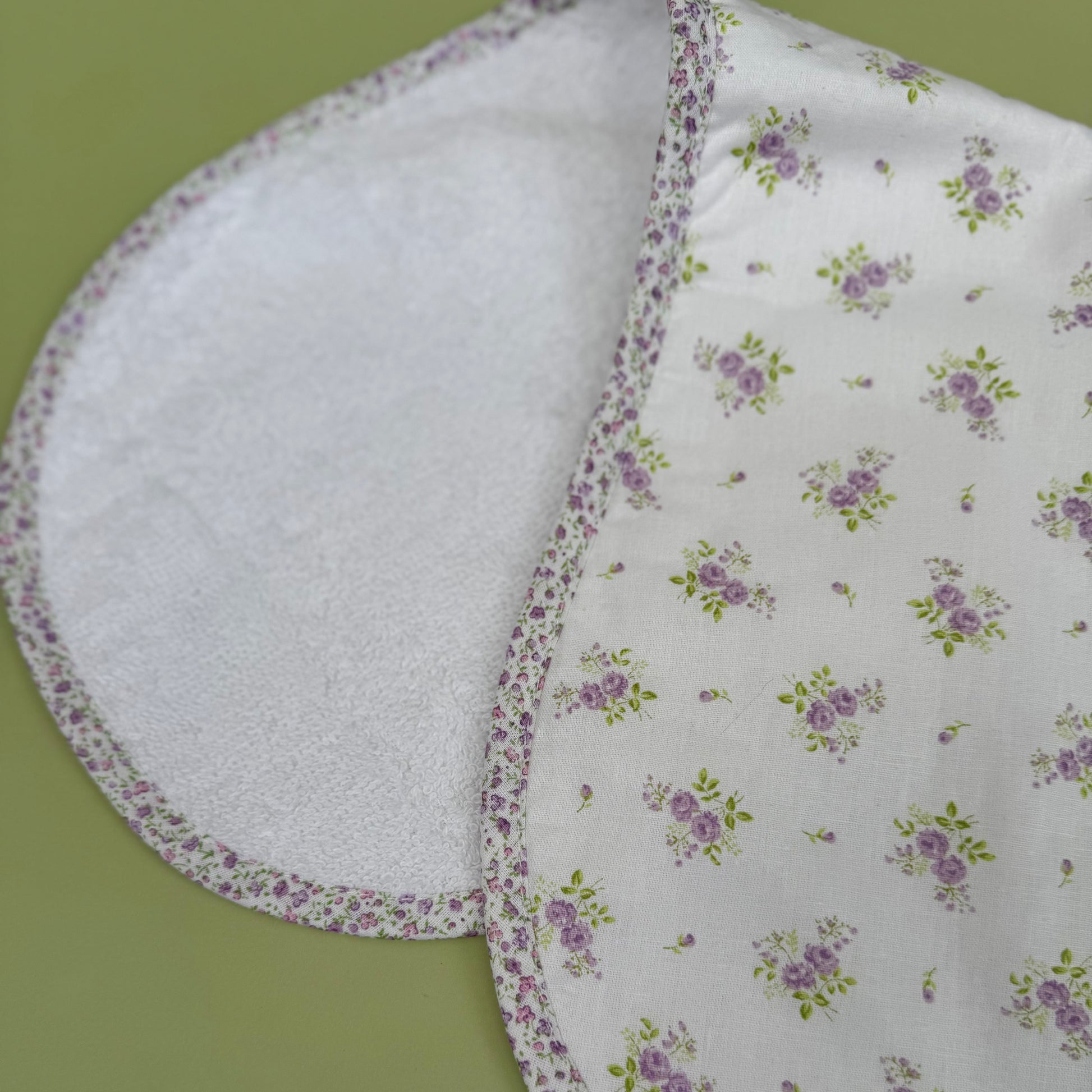 Cotton towelling that is fully lined with a printed cotton in an old fashioned sprig design this towelling burper is immensly practical with a young baby. Fully washable it can be used over and over to protect clothing