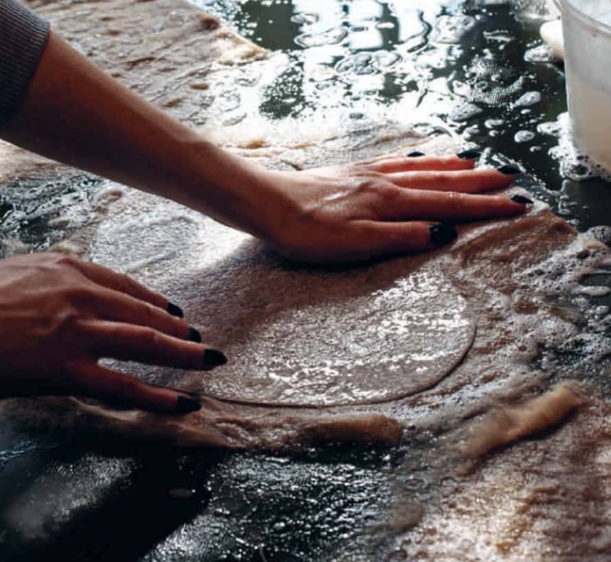 Wool has been known to be felted as far back as 1st century Mongolia. This ancient hand process, uses hot water to agitate and compress the fibres. The yarns hook together to form a single dense fabric.