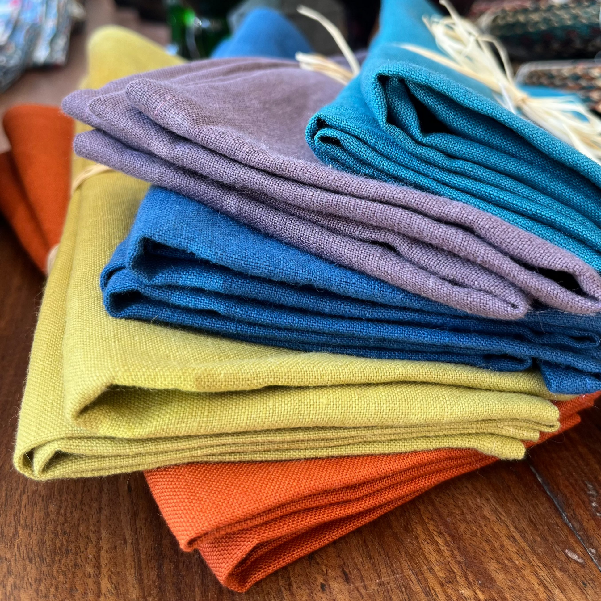 These napkins bring a splash of colour to any table, inside or out. A rustic linen finished with a simple, narrow hem. The colours are inspired by summer and fun. They are sold singly so that you can buy in one colour or have a kaleidoscope mix on your table