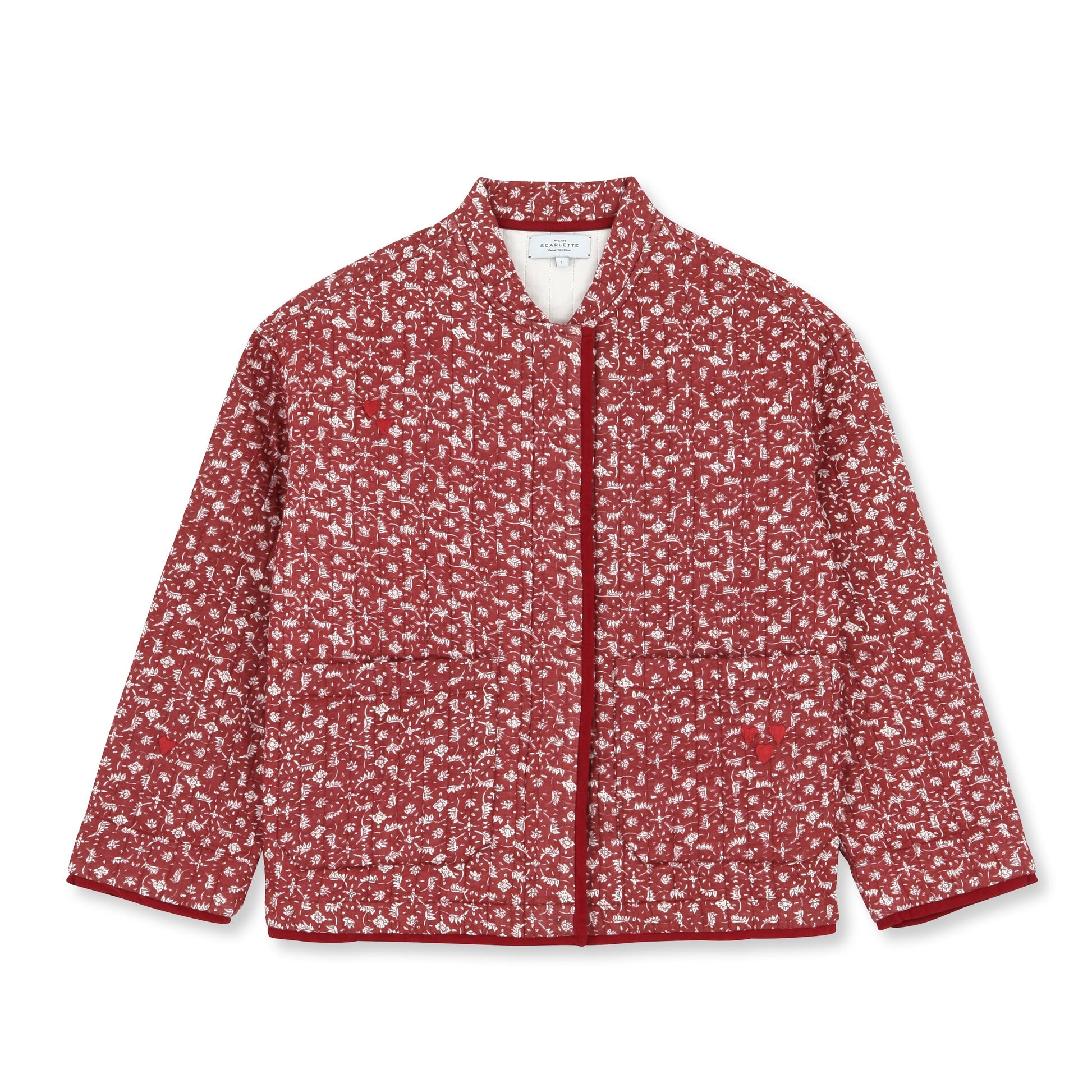 Cotton quilted jacket in a hand block print fabric in a deep red that co-ordinated with the pink nightdresses and nigh shirts in this range