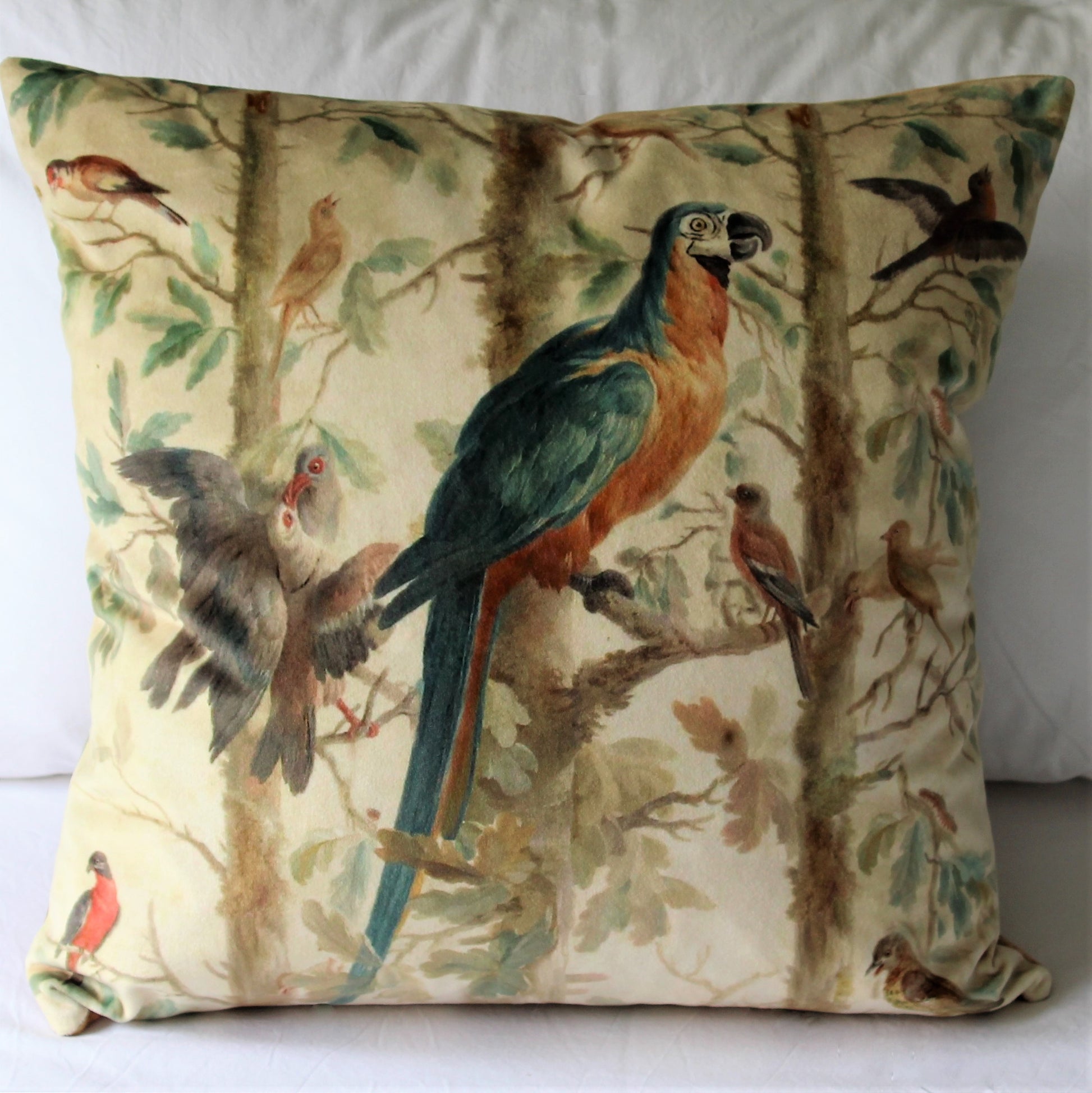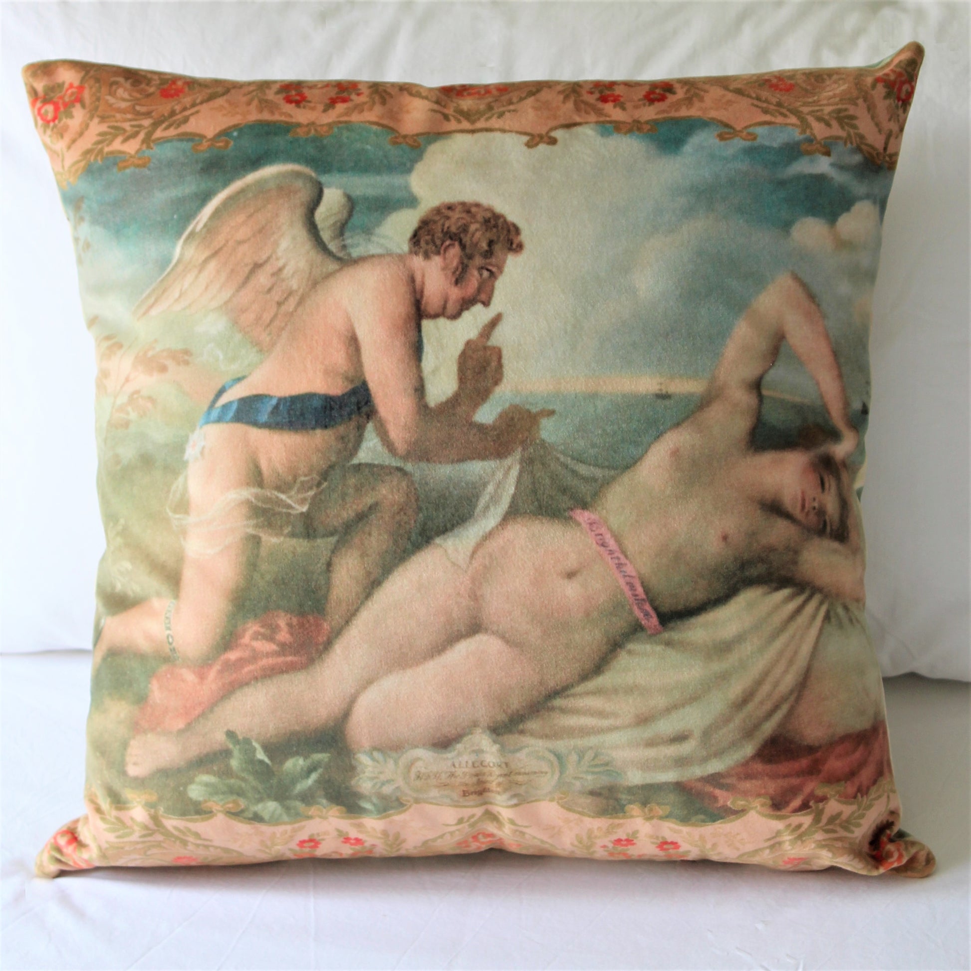 A soft touch printed velvet cushion depicting Rex Whistler's allegorical image of a naked George IV awakening the Spirit of Brighton.
