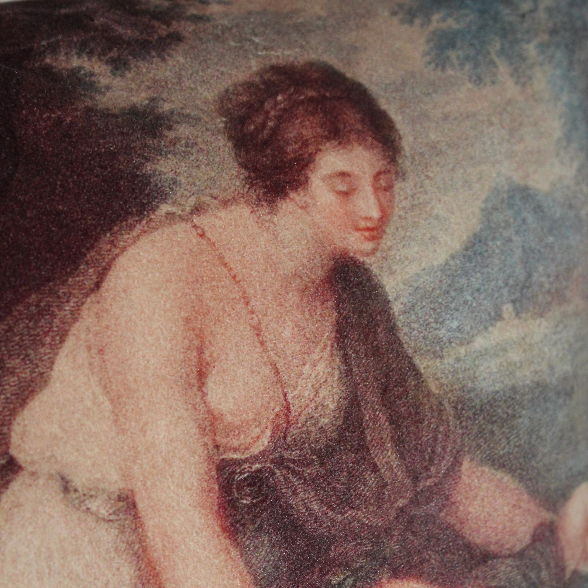 A soft touch printed velvet cushion depicting the Greek Muse of History Clio which is taken from a neo classical painting of the eighteenth century